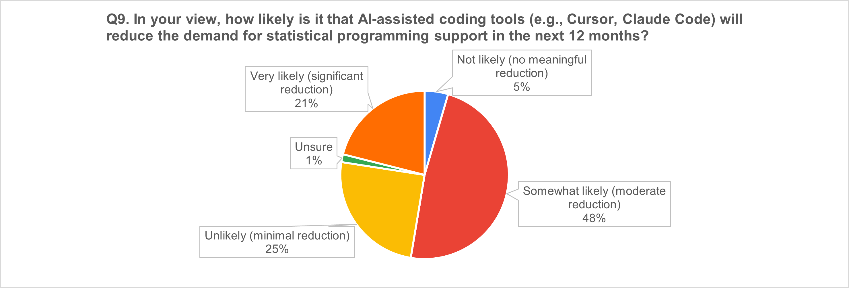 Even where respondents expect coding tools to reduce demand for programming support, the dominant expectation is moderate reduction, consistent with augmentation and productivity shifts more than displacement.